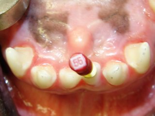 A fractured upper incisor’s pulp chamber and root canal are being cleaned with an endodontic file.