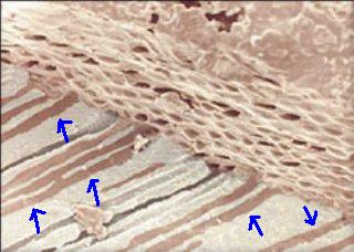 In this microscopic image dentinal tubules are seen (blue arrows) running across the width of the dentin.