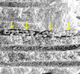 Electron microscopic view reveals bacteria packed dentinal tubule (yellow arrows).