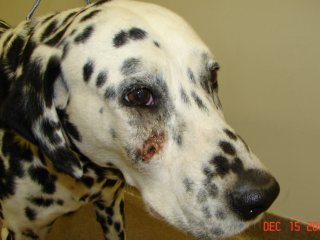 Chronic apical abscess resulted in formation of a draining sinus tract below the eye.