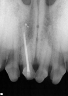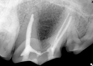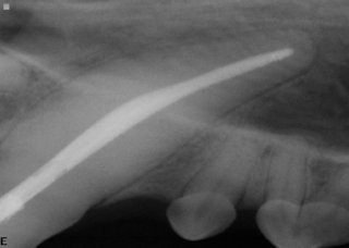 The incisor’s pulp chamber and root canal are filled with an inert material and a sealer cement to prevent future bacterial leakage into the canal space.