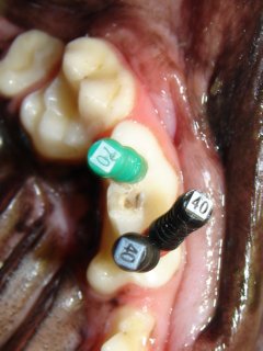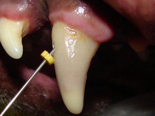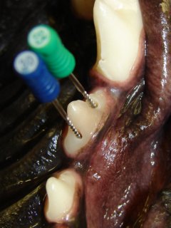 A canine tooth with purplish color change is being cleaned out with an endodontic file.