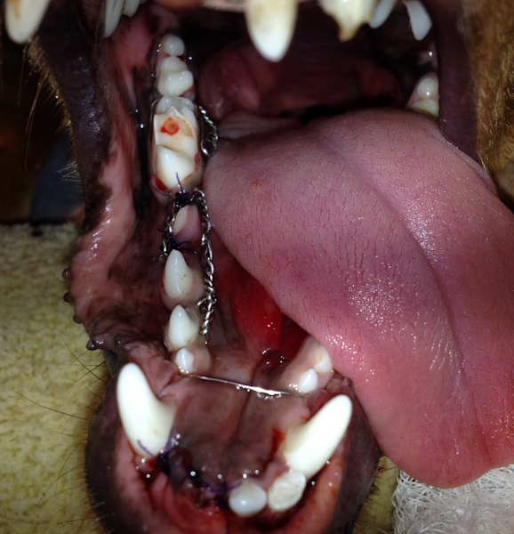 Several surgical techniques are used to repair jaw fractures in dogs and cats, and the chosen method depends on the fracture’s location, severity, and stability, as well as the patient’s size and dental condition. One commonly used approach is interdental wiring combined with an intraoral cold cure composite splint. In this technique, orthopedic wire is carefully placed around selected teeth on both sides of the fracture, and ancold cure composite splint is applied to the biting surfaces of the teeth to stabilize the fractured segments. This method requires the presence of adequate, healthy, and stable teeth on both sides of the fracture to support the wire and splint. It is not suitable for animals with significant tooth loss, advanced periodontal disease, or fractures located in areas without sufficient teeth.