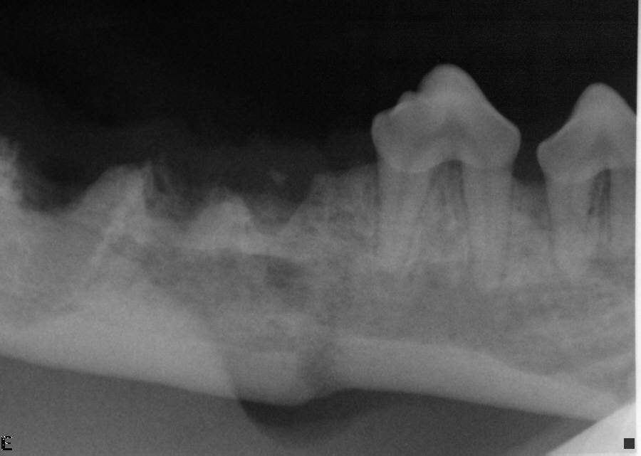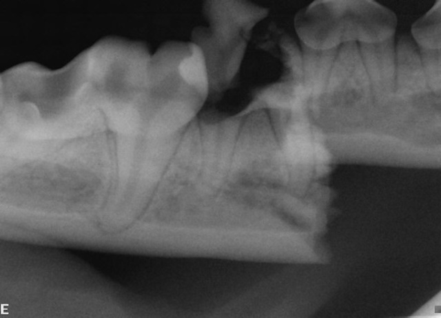 Intraoral radiograph after extractions of endodontically compromised first molar and periodontally compromised fourth premolar teeth. Notice the healed fracture line despite the initial fracture gap.