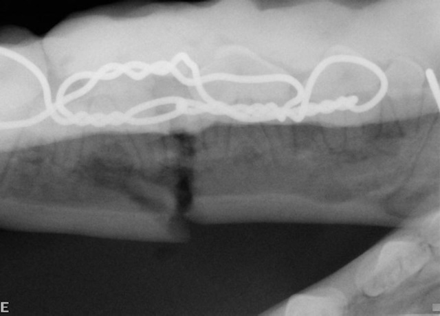 An intraoral cold cure composite splint is placed over the interdental wire to further stabilize the fractured jaw (image above). Intraoral radiograph showing the wire and composite splint. Notice the fracture gap even after careful placement of the wire and composite material (image below).