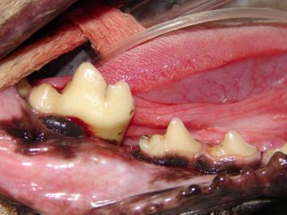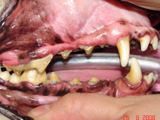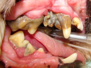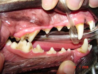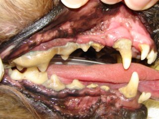 There are two common consequences to severe periodontal disease. The first and most common consequence is an oral-nasal fistula. The roots of the upper canine teeth (fangs) are next to the nasal cavity and separated from it by only a thin sheet of bone. Periodontal disease destroys this thin bone resulting in communication between the oral and nasal cavities. The bacteria, food particles, and other oral debris will enter this area and cause an infection in the nasal cavity. Signs are chronic nasal discharge, sneezing, and occasionally loss of appetite and bad breath. This is diagnosed by the veterinarian introducing a probe into the area under general anesthesia. The treatment in most cases requires surgical intervention.