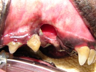 Inappropriate or no closure of the extraction site after upper canine tooth extraction resulted in a big oronasal fistula in this dog.