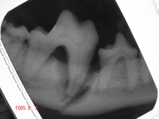 Dental x-ray reveals the significant bone loss around the mesial root and fractured jaw bone. Severe bone loss around the mesial root of this lower first molar tooth is caused by periodontal disease which eventually led to jaw fracture between the fourth premolar tooth and first molar tooth.
