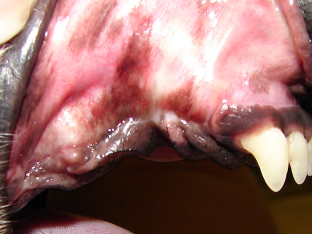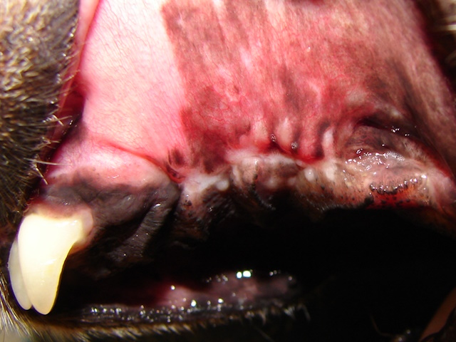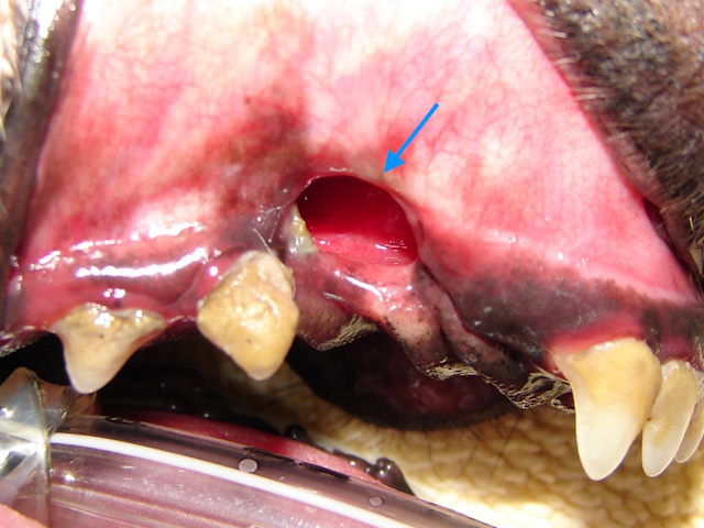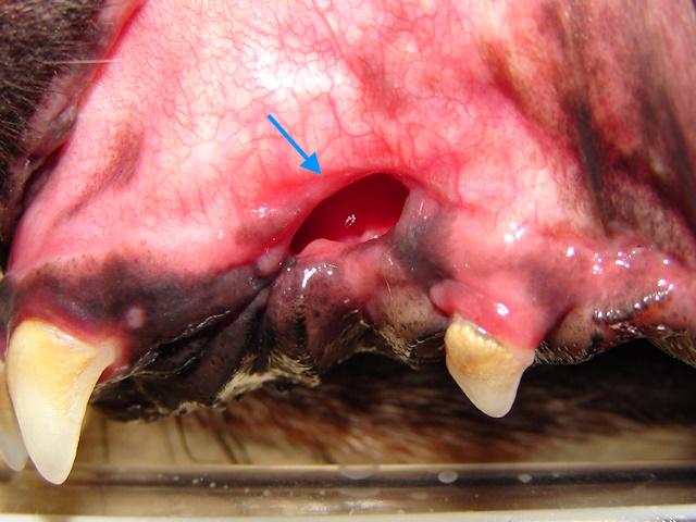 In this Dachshund breed dog, due to significant periodontal disease and bone loss, both left and right upper canines fell off, leaving openings in the mouth that communicate with the nasal cavity (oronasal fistulas).