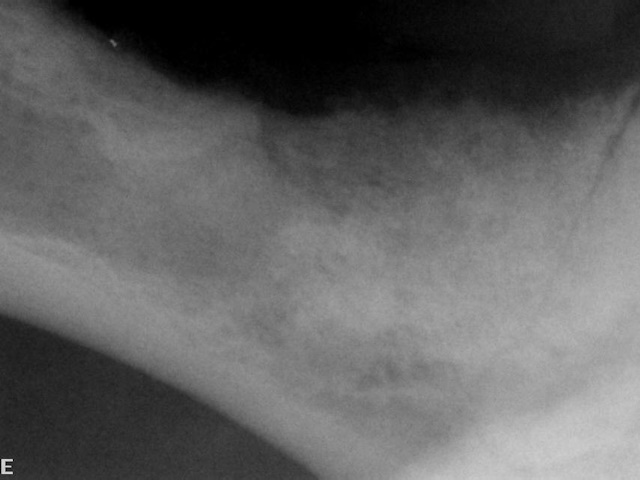 Clinical signs of maxillary and mandibular osteomyelitis vary depending on the location and severity of disease but often include facial swelling, oral pain, halitosis, draining tracts along the face or gingiva, and loose or missing teeth. Animals may show reluctance to eat, dysphagia, or weight loss due to discomfort. Maxillary involvement can result in nasal discharge, epistaxis, or sneezing if infection extends into the nasal cavity or maxillary sinus, while mandibular osteomyelitis may lead to mandibular instability or pathologic fracture in advanced cases. On oral examination, exposed bone, gingival ulceration, or purulent discharge may be observed, and chronic cases may show facial asymmetry or deformity.
