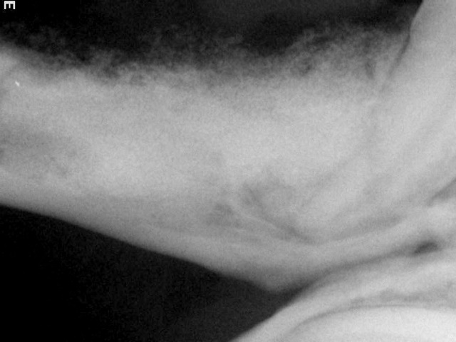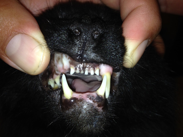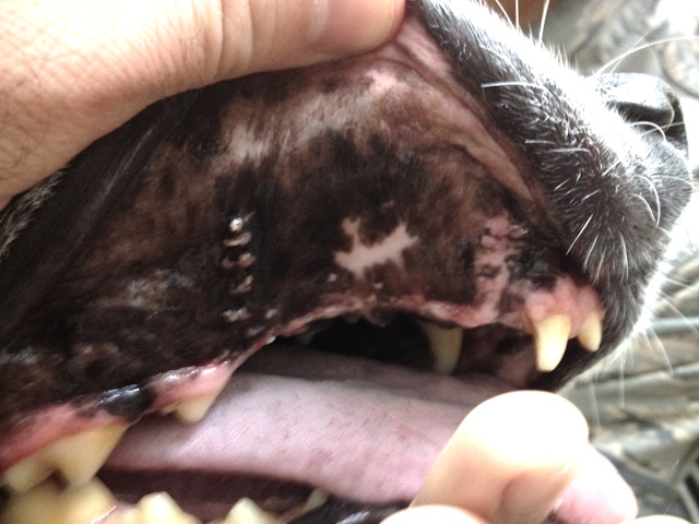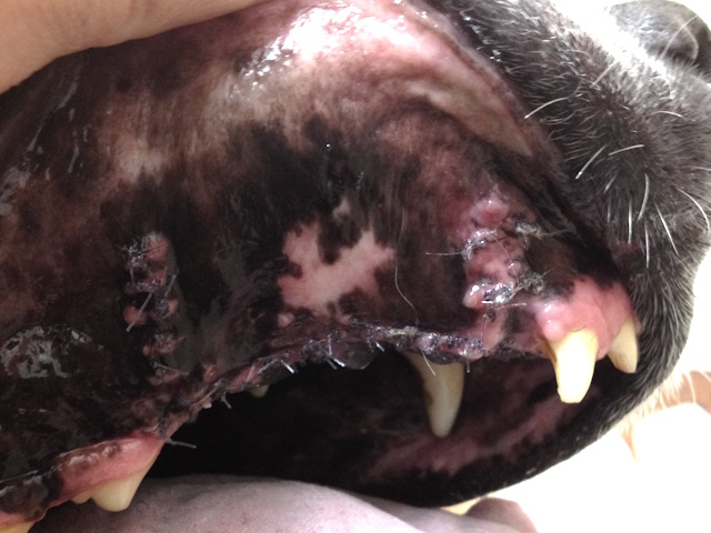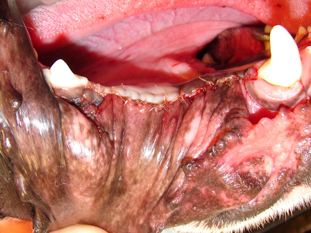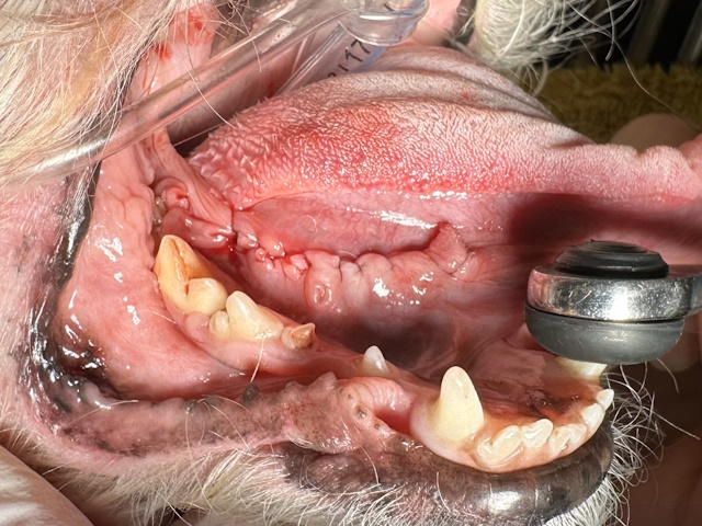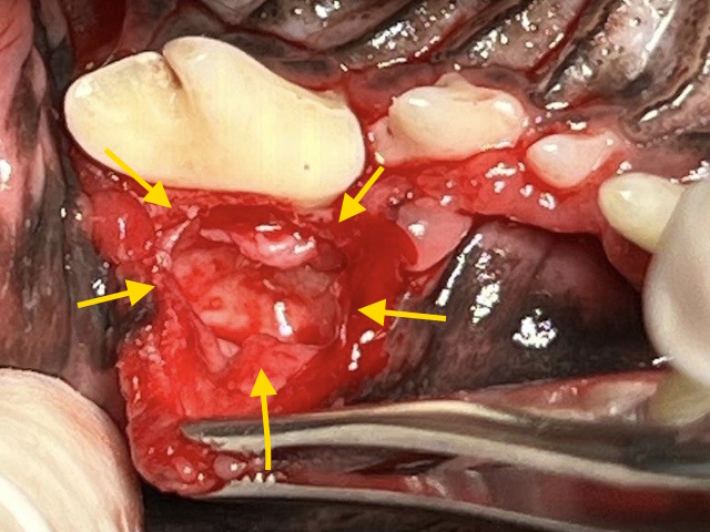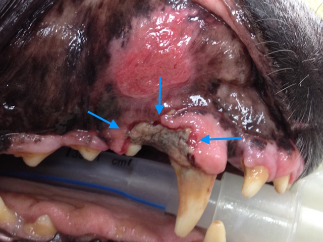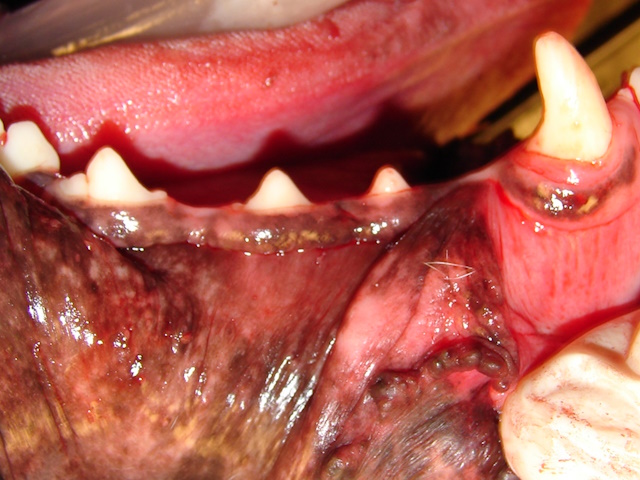Examination of the bone with surgical exploration revealed more dead bone under the gumline around the canine and premolar teeth so these teeth were extracted and all the necrotic dead bone was debrided.