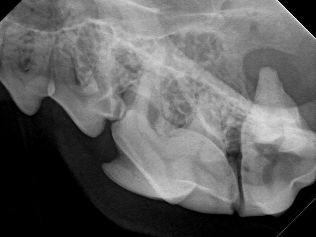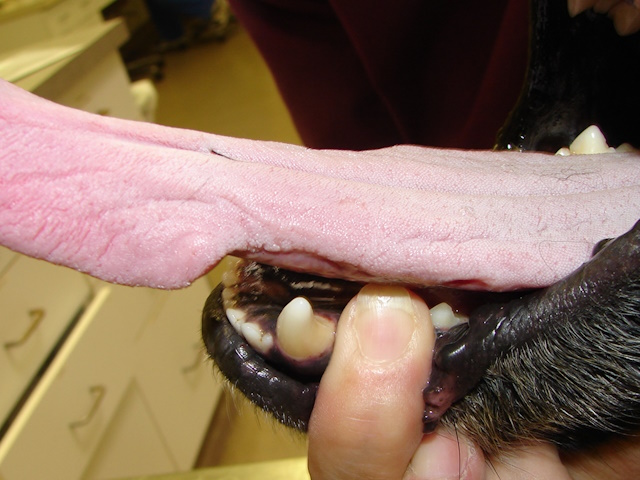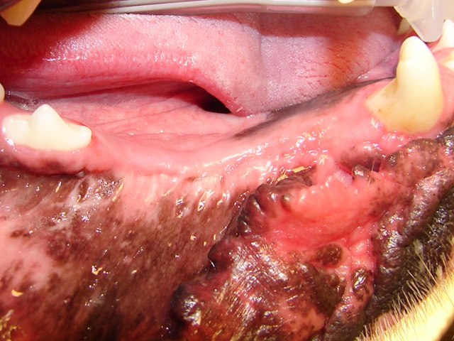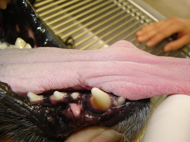 Clinical appearance of the right mandible of a Boxer dog. Notice the first mandibular premolar behind the canine is missing.