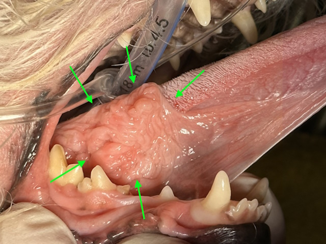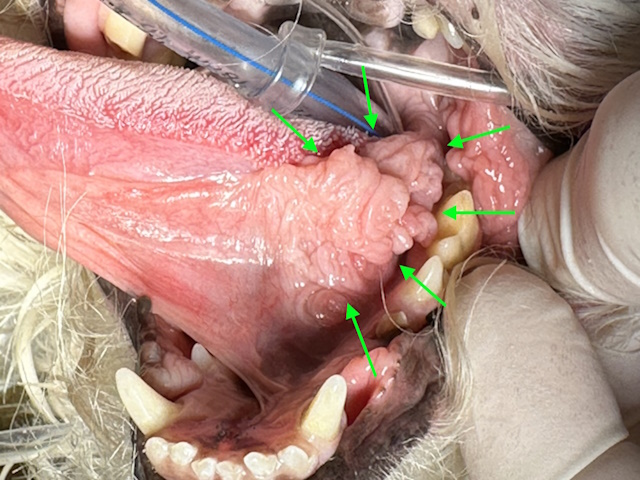 Clinical signs typically involve visible oral discomfort and the presence of slow-growing, proliferative masses under the tongue. Owners may notice their dog mouth chattering, vocalizing in pain while eating, or dropping food. The lesions themselves often appear as firm, raised, and sometimes ulcerated nodules that can be bilateral (occurring on both sides). In advanced cases, the significant tissue enlargement may be accompanied by hemorrhage or secondary infection. Because these granulomas are often non-painful in early stages, they are frequently discovered during routine sedated oral examinations before behavior changes are noted.