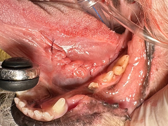 The primary treatment for sublingual granulomas is the surgical resection of redundant, hyperplastic tissue. Removal of too much of the sublingual fold should be avoided. In cases where the condition is driven by malocclusion or specific teeth irritating the tissue, extraction of the offending teeth may be necessary to prevent recurrence. Post-operative care typically involves soft food and monitoring to ensure the “gum-chewing” habit does not return as the site heals.