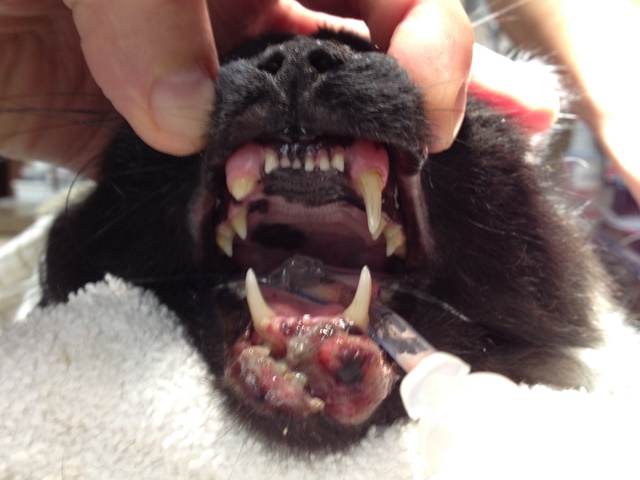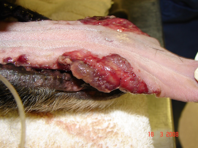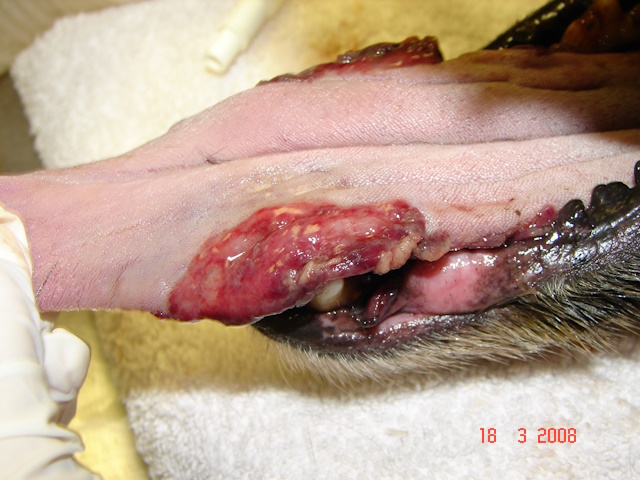 Lower lip avulsion with proliferative infected soft tissue (indication of chronicity) in a cat.