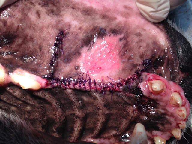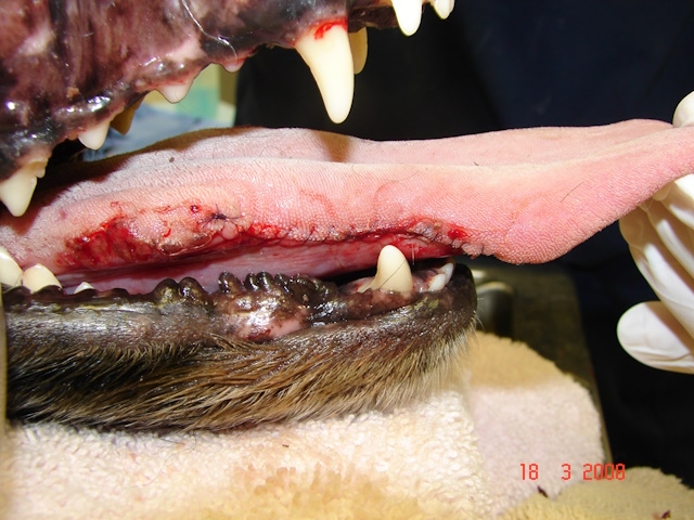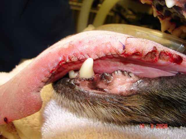 Healing after surgical correction in 3 weeks. Incisors were extracted for better tissue apposition.