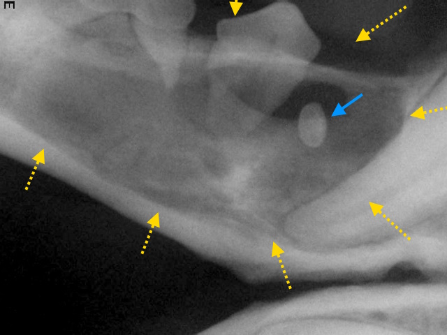 Dental radiograph of this area reveals the small, disfigured mandibular first premolar (blue arrow) inside a large bone cyst (highlighted by the yellow arrows).